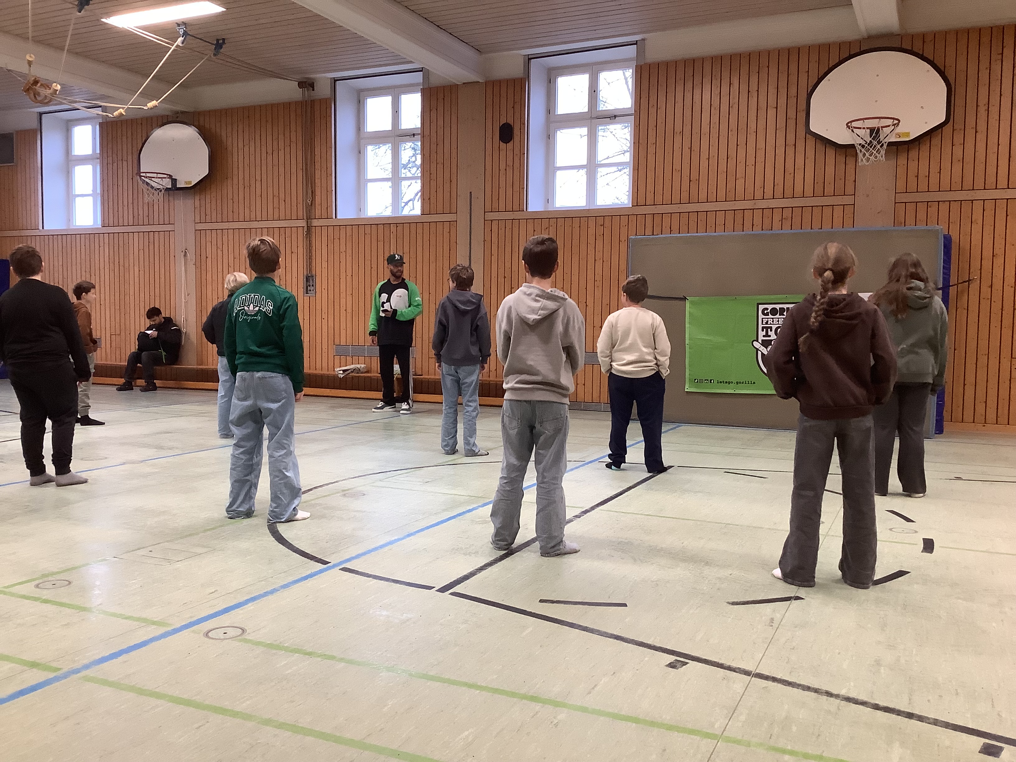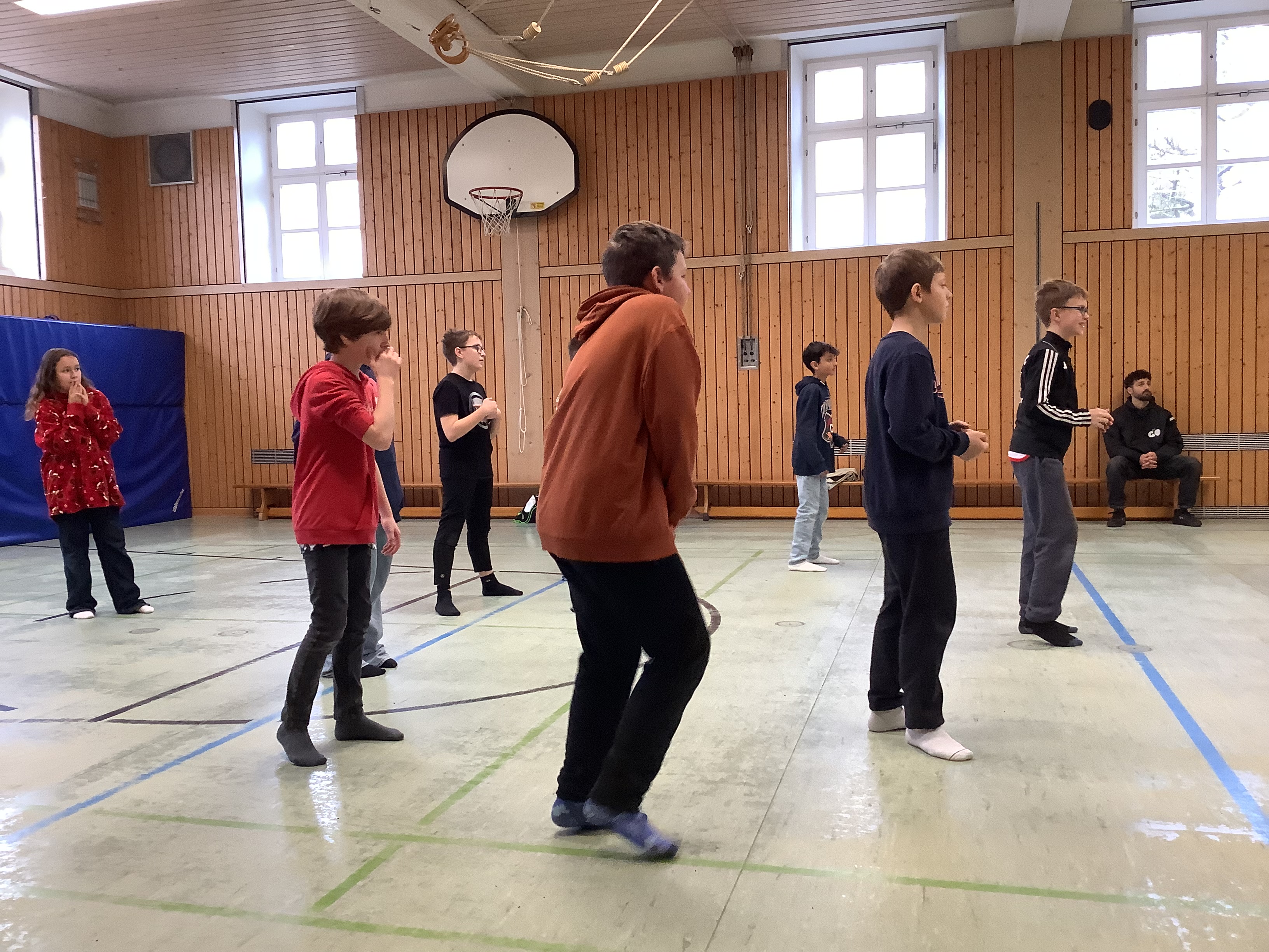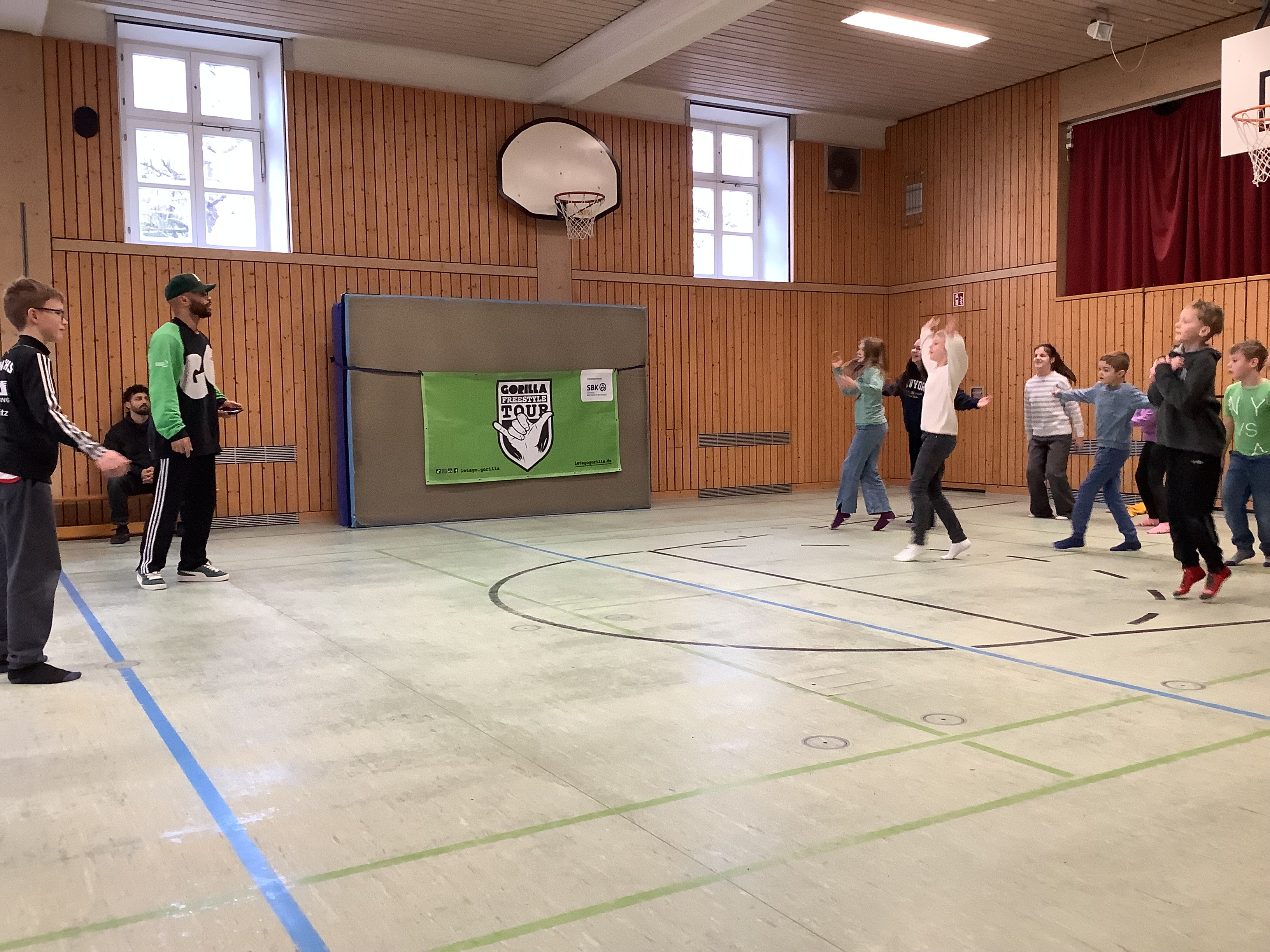 Das beeindruckte unserer Schülerinnen und Schüler sehr, vor allem als die beiden ihre besten Moves noch live vorführten. Aber danach waren sie selber dran und lernten Schritt für Schritt eine beeindruckende Breakdance-Choreo. Da kamen einige ganz schön ins Schwitzen! Am Ende hatten unsere Fünftklässler eine Menge Spaß und vielleicht haben ja ein paar davon Lust bekommen, eine kleine Vorführung bei unserem Kleinkunstabend zu geben…