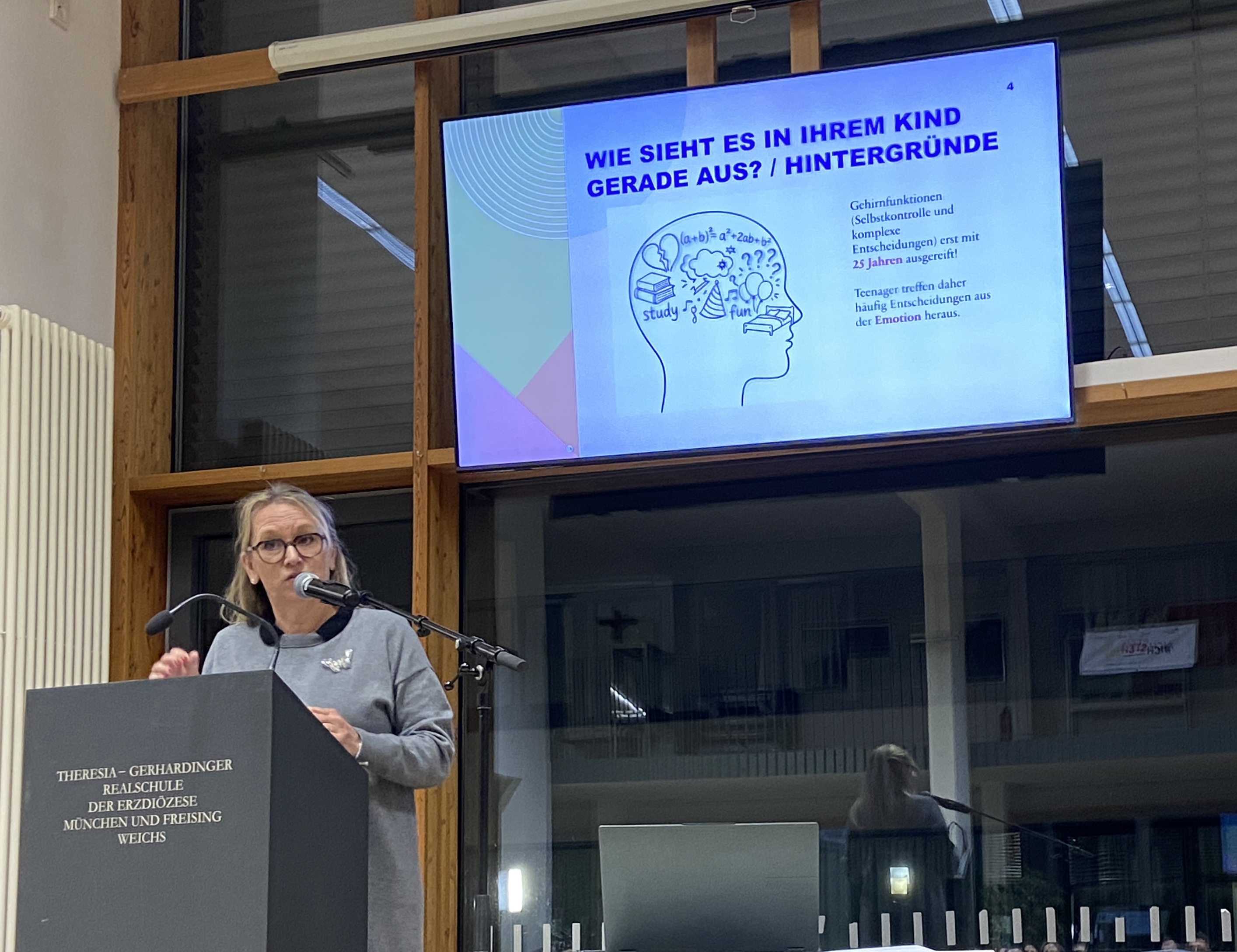 Vor den zahlreich erschienenen, interessierten Eltern sprach Frau Wülfing über die Probleme von Kindern und Jugendlichen beim Lernen zuhause und wie man als Elternteil unterstützend wirken und eingreifen kann. Als ausgebildete Lerncoachin, Lehrerin und Mutter inzwischen erwachsener Söhne konnte Frau Wülfing auch aus eigener Erfahrung sprechen und viele hilfreiche und interessante Tipps und Ideen für eine andere Herangehensweise an das Thema „Lernen daheim“ an die Anwesenden weitergeben.